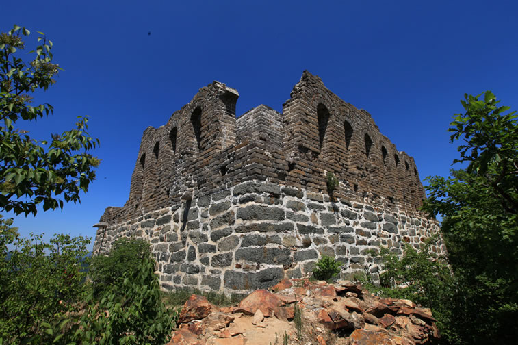 九眼樓長城 九眼樓長城位于四海鎮(zhèn)火焰山頂部。因敵樓每面有9個箭窗,故名。又因山勢高峻,晴天可望到北京城,故也稱望京樓。為長城重要關口之一。海拔1141米,F(xiàn)樓內(nèi)有灶炕、居室遺跡,近處有馬場、晾馬場、軍營(營城)遺跡。樓北側(cè)有明代官員徐申于萬歷十三年(公元1585年)巡行到該地書寫的大理石碑一方。 九眼樓為正方雙層建筑,因每邊有九個了望孔而得名,現(xiàn)存一層,高度為7.8米,每邊為13米,了望孔高1.65米,寬0.5米,內(nèi)有軍士來往巡視寬1.2米的環(huán)行步道。九眼樓下部砌石條,上部用白灰砌青色城磚,構(gòu)建十分堅固而壯美。樓下西側(cè)有小平臺,為軍士集中的場地。平臺北側(cè),有磚砌的臺階,沿臺階可達樓南門。樓頂為磚砌券拱式結(jié)構(gòu),樓內(nèi)寬大,可住兵儲器,向北開兩窗,四面各有一門,門高兩米,闊1.2米,出入極便利。 |