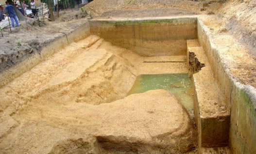草鞋村遺址位于北海市合浦縣廉州鎮(zhèn)草鞋村,西臨南流江分支—廉州西門江。發(fā)現(xiàn)陶窯、磚窯共22座,建筑遺址5處,水井5口及一批作坊遺跡,呈環(huán)狀分布于遺址臺地的坡坎四周,初步判定為漢代嶺南地區(qū)重要的官營手工業(yè)作坊。