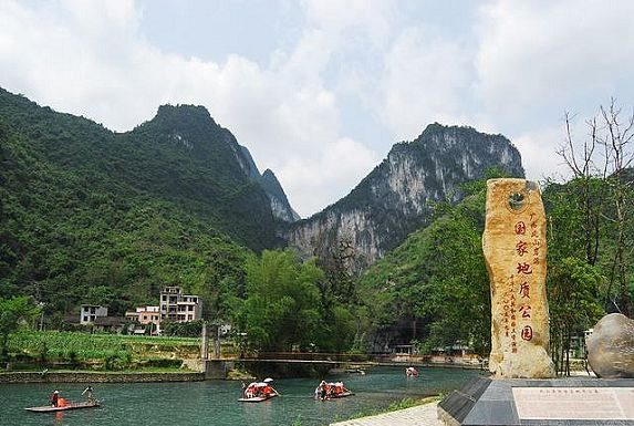 廣西樂業(yè)-鳳山世界地質(zhì)公園,位于廣西西北部云貴高原向廣西盆地過渡的斜坡地帶,由百色市樂業(yè)大石圍天坑群國家地質(zhì)公園和鳳山巖溶國家地質(zhì)公園組成,總面積930平方千米,F(xiàn)已發(fā)現(xiàn)大小天坑30個(gè),是世界上最大的天坑群之一。地質(zhì)公園區(qū)中鳳山三門海景區(qū)擁有高穴馬王洞和水上天坑等地質(zhì)遺跡。天坑群中以大石圍天坑規(guī)模最大,深度和容積居世界第二;坑底森林面積10.5 萬平方米。