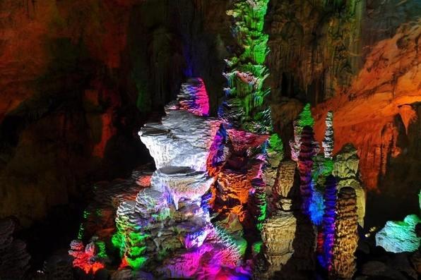 鴛鴦洞,位于縣城東面,鳳凰山腰,海拔700余米,為云貴高原南緣巖溶中高位雙層溶洞,洞中石柱、石筍、石幔琳瑯滿目。洞口高7.5m,寬12m。洞長480米,最寬處320米,巖廳最高點(diǎn)52米,面積為2.5萬平方米,洞內(nèi)大廳規(guī)模宏大。從洞口進(jìn)入便是第一層洞,游程迂回全長1200米,洞中乳石崢嶸,石筍高達(dá)36.4m,象擎天巨柱直插天空,20m以上高度的石筍約15個(gè),6m左右高度的石筍更是不計(jì)其數(shù),在多處聚集形成了奇特的洞中石林景觀。洞內(nèi)最大的石幔高約15m,寬6m,顏色潔白,酷似瀑布。