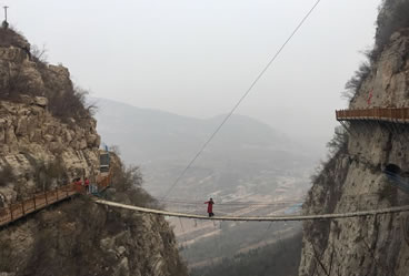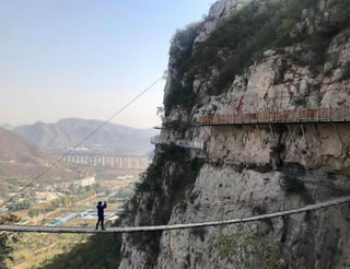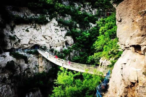 佛爺洞與七星洞有一峽谷相隔,景區(qū)開發(fā)者便凌空架起一道35米開的鐵索橋,把天塹變?yōu)橥ㄍ臼箖啥聪噙B,人踏鐵索橋一步九顫蕩悠悠,頓生“大渡橋橫鐵索寒”之感。不過(guò),這里的鐵索橋絕對(duì)安全,被人譽(yù)為“冀南一絕有驚無(wú)險(xiǎn)”是游人獵奇探險(xiǎn)鍛煉意志和膽量的絕佳場(chǎng)所。