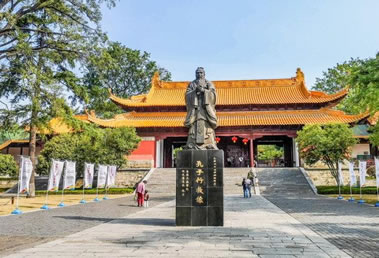 宮墻兩端各有磚坊一座,三間三拱門,中門較高大,上面有磚刻橫額,東為“德配天地”,西為“道貫古今”。這八個(gè)大字都是曾國藩所書。