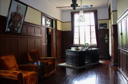 總統(tǒng)辦公室位于總統(tǒng)辦公樓(子超樓)二層的東南角,是一個(gè)由三個(gè)房間組成的套房,曾是蔣介石的辦公室。中間的一間為辦公室,臨窗有一巨形寫字臺(tái),寫字臺(tái)上有一本臺(tái)歷,臺(tái)歷的日期仍然是1949年4月23日,這天是南京的解放日,歷史在這里定格。一張?zhí)刂频钠まD(zhuǎn)椅,會(huì)客用的沙發(fā)上方懸掛著蔣介石身穿戎裝的巨幅照片,四周的墻壁上則是嵌入墻體的文件柜,屋頂上懸掛著從法國里昂進(jìn)口的磨砂玻璃吊燈。辦公室東間為休息室,配有衛(wèi)生間。西間為書房和接待室。