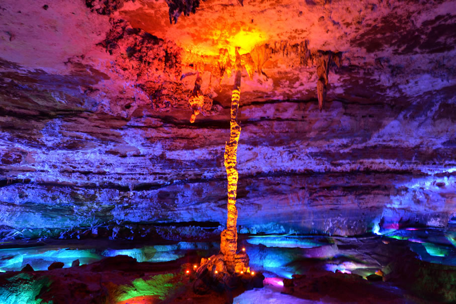 - 水洞:第一層水洞蜿蜒,原可乘船,現(xiàn)改浮橋游覽,兩岸石柱、石筍密布,燈光下如夢(mèng)如幻。