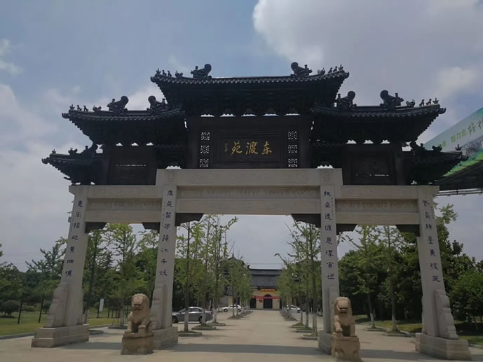 東渡苑景區(qū)位于江蘇省蘇州市張家港市塘橋鎮(zhèn),地處204國道與338省道交匯處,占地面積95300 m²。該地為公元753年唐代高僧鑒真第六次東渡日本成功的啟航地,古稱黃泗浦。據(jù)《沙洲縣志》記載:"唐高僧鑒真東渡日本連續(xù)五次失敗后,第六次于黃泗浦口啟航東渡成功。"1963年設(shè)立石質(zhì)經(jīng)幢作為紀(jì)念。景區(qū)包含鑒真東渡紀(jì)念館、東渡寺、碑亭等仿唐建筑群,其中主館供奉高2.06米的鑒真銅像,壁畫展現(xiàn)其第六次東渡歷程,后方木刻書屏節(jié)選《東征傳》記載第六次東渡細(xì)節(jié)。遺址區(qū)發(fā)現(xiàn)唐代河道、寺院類建筑遺存及石佛雕像,出土長(zhǎng)沙窯執(zhí)壺等外銷瓷器和宋代銘文磚,2013年列為全國重點(diǎn)文物保護(hù)單位,2018年入選全國十大考古新發(fā)現(xiàn)。景區(qū)現(xiàn)存東渡橋橫跨黃泗浦兩岸,橋側(cè)碑亭刻有阿倍仲麻呂詩作及郭沫若題詩,種植雪松、桂花等50余種植物構(gòu)成江南水鄉(xiāng)景觀。