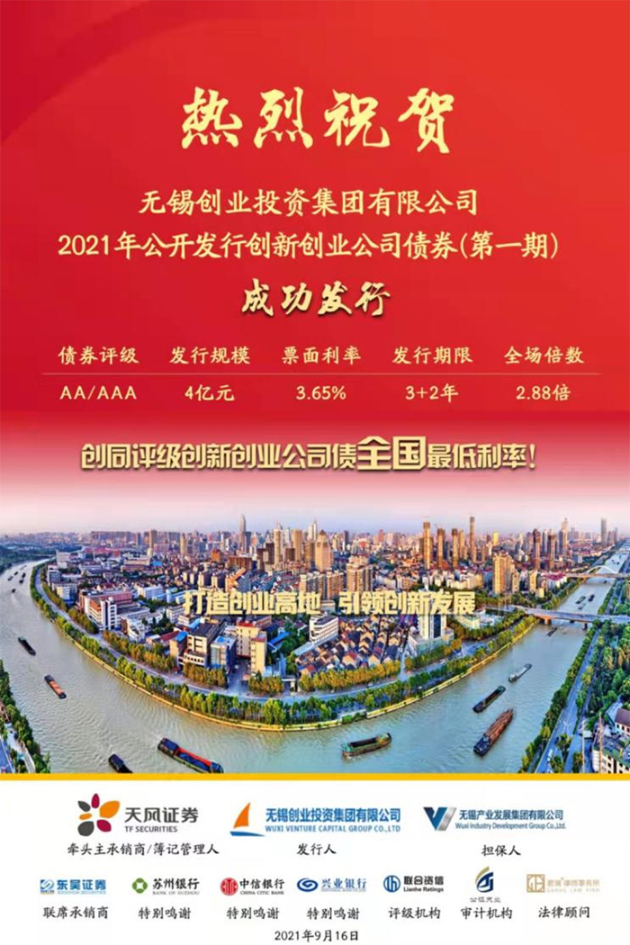 | 利率全國最低!無錫創(chuàng)投集團(tuán)成功發(fā)行創(chuàng)新創(chuàng)業(yè)公司債券 |
