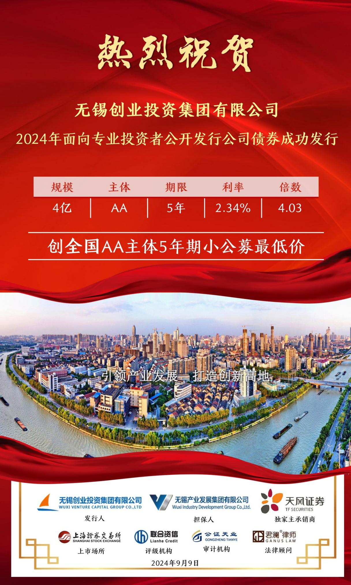 9月9日,無錫創(chuàng)業(yè)投資集團(tuán)有限公司(簡稱“無錫創(chuàng)投集團(tuán)”)2024年面向?qū)I(yè)投資者公開發(fā)行公司債券“24錫創(chuàng)01”成功發(fā)行,發(fā)行規(guī)模4億元,發(fā)行期限5年,認(rèn)購倍數(shù)4.03倍,票面利率2.34%,創(chuàng)全國可比債券歷史發(fā)行最低利率!本期債券由天風(fēng)證券承銷,主體評級AA,債項評級AAA。 無錫創(chuàng)投集團(tuán)作為無錫產(chǎn)業(yè)集團(tuán)旗下的創(chuàng)業(yè)投資和股權(quán)投資平臺,近年來在集團(tuán)的正確領(lǐng)導(dǎo)和大力支持下,圍繞無錫“465”現(xiàn)代化產(chǎn)業(yè)集群建設(shè),聚焦產(chǎn)業(yè)集團(tuán)“1+4+X”產(chǎn)業(yè)布局,持續(xù)深化產(chǎn)融協(xié)同合作,不斷提升資金使用效率,努力為公司高質(zhì)量發(fā)展提供更低成本、更長周期、更加靈活的資金支持。未來,公司將繼續(xù)承擔(dān)國企社會責(zé)任,勇挑重?fù)?dān),發(fā)揮自身優(yōu)勢,持續(xù)為無錫新質(zhì)生產(chǎn)力和實體經(jīng)濟(jì)高質(zhì)量發(fā)展注入新活力、增添新動能。 |