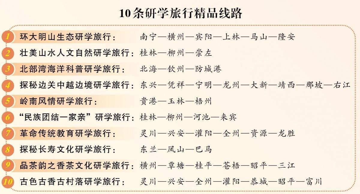這些線路涵蓋廣西各大研學(xué)旅行景區(qū)和課程,涉及人文、紅色、民俗、自然等各方面,注重從區(qū)域的人文地理、風(fēng)土人情、歷史物產(chǎn)、經(jīng)濟文化多重融合入手,形成具有探索性、趣味性、創(chuàng)造性的研學(xué)旅行主題。