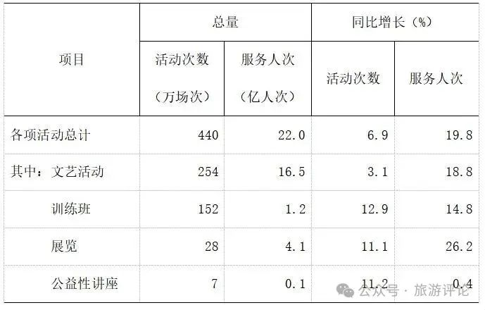 全年全國群眾文化機構(gòu)共組織開展各類文化活動440萬場,同比增長6.9%;服務22億人次,同比增長19.8%。