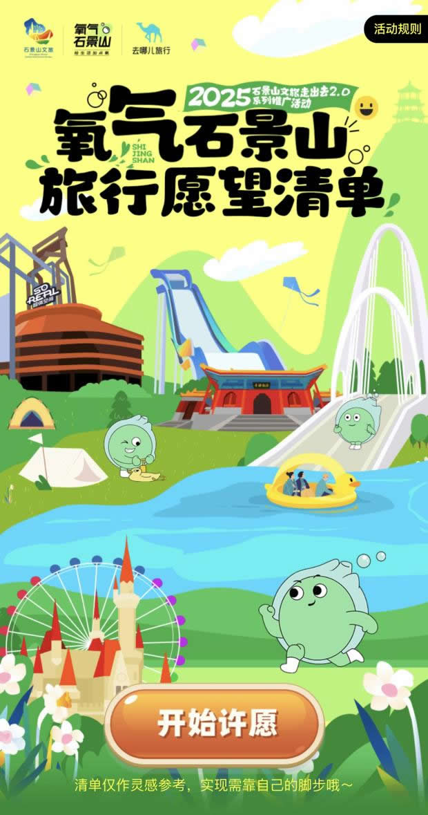 在“去哪兒”旅行APP上線“氧氣石景山”文旅專題頁,不僅整合酒店榜單、景區(qū)門票、優(yōu)質(zhì)攻略等核心文旅資源,更特別設置石景山區(qū)對口支援和協(xié)作地文旅產(chǎn)品版塊,實現(xiàn)“石景山推廣+支援地區(qū)助銷”雙重價值。同步推出的“旅行打卡愿望清單”H5,線上用戶可點亮自己的石景山旅游心愿,生成專屬旅行愿望清單;在高校路演活動中,大學生可分享H5到社交媒體作為參與活動的入場券——既為高;顒宇A熱,更成為高校路演入場憑證,串聯(lián)起“線上互動-線下參與”的閉環(huán)。