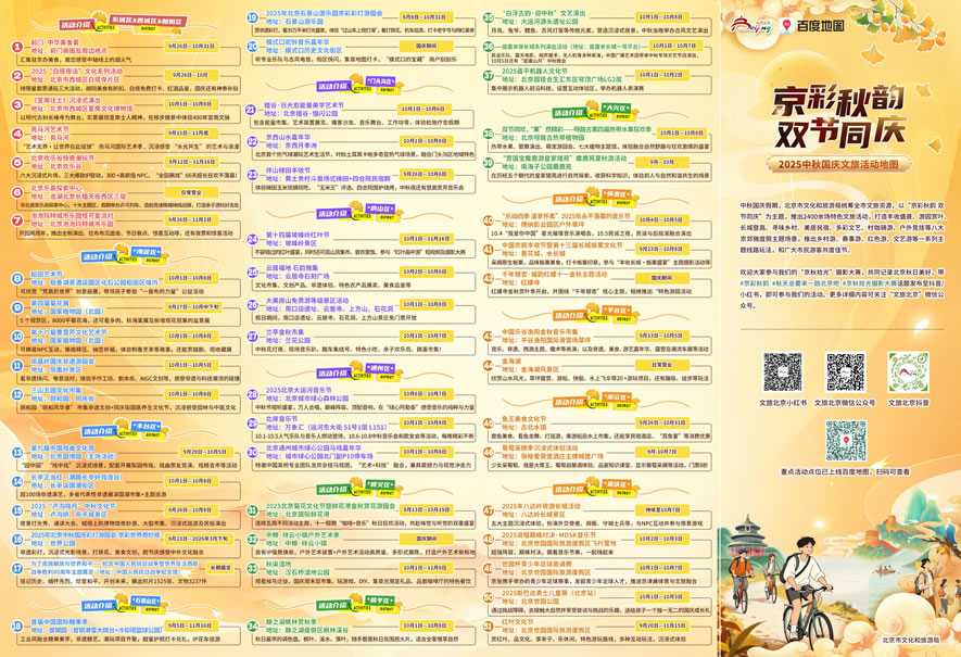 為豐富假期生活,北京市文化和旅游局聯(lián)合百度地圖推出“中秋國(guó)慶文旅活動(dòng)地圖”,集中呈現(xiàn)全市50余項(xiàng)特色文旅活動(dòng),涵蓋自然風(fēng)光、文化體驗(yàn)、親子娛樂(lè)、紅色教育等多個(gè)主題,助力公眾輕松規(guī)劃假日行程,盡享京秋韻味。