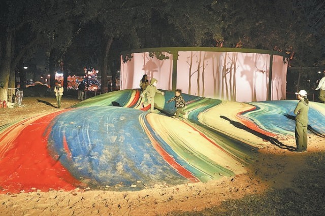 朝陽(yáng)公園中心島,孩子們?cè)跓艄獠曙椀纳碁┥贤嫠!?/p>