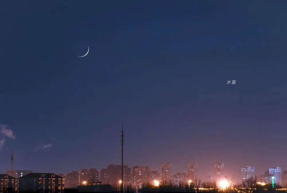 23日21時,火星合月;24日零時,水星合月。23日日落時分,在西南方同一片天區(qū),火星、水星和蛾眉月會近距離“相遇”并形成“雙星拱月”之勢,其中,火星的地平高度最高,水星其次,蛾眉月最低。