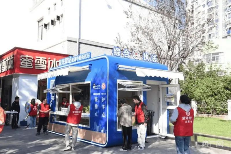 作為街區(qū)重要的“便民樞紐”,星光驛站功能定位清晰明確:面向戶外勞動(dòng)者,這里是一座“能量補(bǔ)給站”,免費(fèi)提供飲水、熱飯、充電等基礎(chǔ)服務(wù),驅(qū)散奔忙的疲憊;對(duì)于周邊居民,它是一處“暖心港灣”,常態(tài)化開展義診、義剪等志愿服務(wù),讓便利直達(dá)身邊;針對(duì)沿街商戶,驛站則是一個(gè)“助力平臺(tái)”,及時(shí)更新政策手冊(cè)、提供證照辦理咨詢,助力經(jīng)營(yíng)發(fā)展。