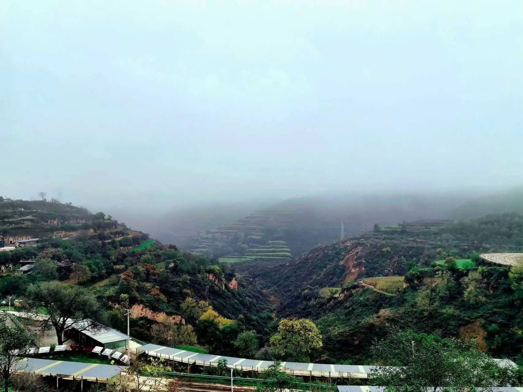 大寨鄉(xiāng)海拔1540米、北緯35.38度,屬溫帶半干旱氣候,四季分明、風景宜人,豐富的水資源和廣袤的植被共同構筑了獨特的局部小氣候,使得大寨鄉(xiāng)在降雨之后,常常云霧繚繞。如紗的霧氣縈繞于山巒溝壑之間,將遠山近樹渲染成一幅流動的水墨畫。