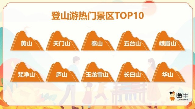 登山游熱門景區(qū)方面,黃山、天門山、泰山、五臺山、峨眉山、梵凈山、廬山、玉龍雪山、長白山、華山等憑借各自獨特的自然風光與深厚的文化底蘊,成為途牛用戶更為熱門的選擇,位列“2025登山游熱門景區(qū)榜單”前列。