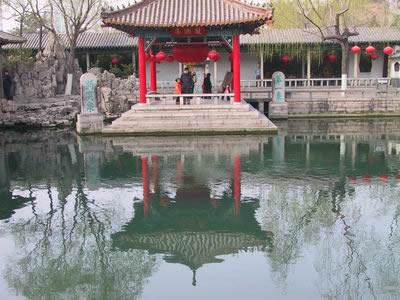 有一組較大的古建筑群在趵突泉北岸,通稱三大殿。最南“濼源堂”,三間兩層,歇山飛檐,建于北宋年間,挹廈柱上,刻有元代文學家、書法家趙孟兆的著名詩句:“云霧潤蒸華不住,波濤聲震大明湖。”字體雄渾有力,詩句傳神,與波光水影交相輝映更為之添彩。殿后面又有兩殿,原為“娥姜祠”,現(xiàn)改寫為“娥英祠”,世人為贊頌舜的兩位妃子娥皇、女英而建祠,以志紀念。在三大殿院內(nèi)的花格透墻上,鑲嵌著30余方石刻,都是歷代名人的詩篇。特別珍貴而又不同凡響的是院內(nèi)的那尊的“雙御碑”,記載著康熙三臨、乾隆二臨趵突泉的題詞詩文,標示著趵突泉的非凡地位。