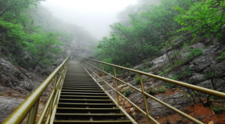 位于旅游南線,從下到上,一共有488級階梯,上下直線距離近兩百米,是連接南線進入景區(qū)絕佳景觀的必經之路,直上直下,有“平步青云”的寓意。