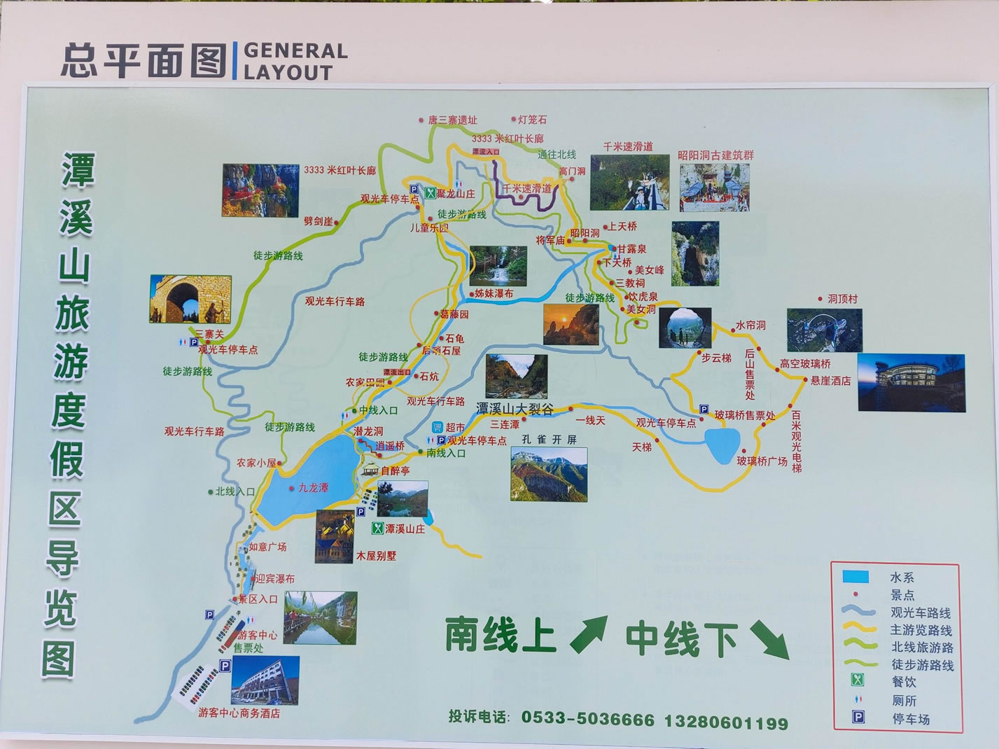旅游中線:全程約1小時,以農家風光、休閑娛樂為特色,主要景點有:潭溪山大瀑布、如意廣場、九龍?zhí)、潭溪山莊、自醉亭、潛龍洞、逍遙橋、潭溪山古酒坊、農家田園、后哨石屋、櫻桃峪、神龜探路、姊妹瀑布、兒童撒野樂園、乘觀光車下山。