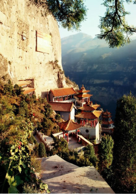 2、抱腹巖的山勢奇特為天下"絕無僅有"。它高60米,寬180米,深50米。可以抱二百余間殿宇館舍及一兩萬名游人于其中。驚險壯觀的巖下飛空掛鈴,更為一絕。