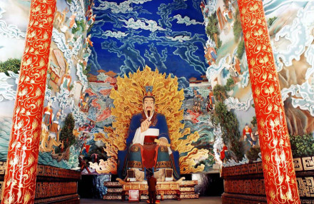 6、大羅宮是一座依山而建的明四暗七仿古建筑,總面積達(dá)30000平方米,堪與布達(dá)拉宮媲美,為天下第一道宮。宮內(nèi)300平方米中國百位名家題寫的《道德經(jīng)》木刻,以及300平方米的布畫都是中國一絕。