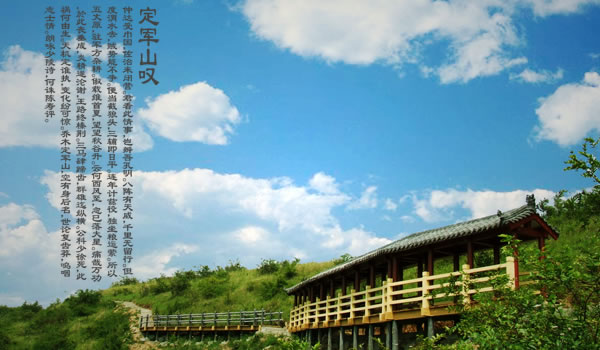 定軍山:定軍山位于陜西省漢中市勉縣城南5千米,三國(guó)時(shí)期古戰(zhàn)場(chǎng)。為省級(jí)風(fēng)景名勝區(qū)。原屬武侯墓鄉(xiāng),今屬定軍山鎮(zhèn)轄區(qū)。三國(guó)時(shí),蜀將黃忠斬夏侯淵、趙顒?dòng)诖,在歷史上遂負(fù)盛名。屬大巴山脈,其脈自高廟子入平地,隆起秀峰12座,自石山子至元山子,號(hào)稱“十二連峰”,再東為當(dāng)口寺孤峰,自西向東綿延十多公里,如游龍戲珠,故有“十二連山一顆珠”之譽(yù)。主峰定軍山為最高處,海拔833米,山頂原有“古定軍山”石碑,文革被毀,今新立。山南有一個(gè)天然鍋底形的大洼,周長(zhǎng)1.5千米,即三國(guó)時(shí)稱為“可屯萬(wàn)兵”的“仰天洼”。北麓有一片廣漠沃野,就是當(dāng)年諸葛亮大布“八陣圖”、設(shè)“督軍壇”的武侯坪,黃忠大戰(zhàn)夏侯淵的戰(zhàn)場(chǎng),時(shí)常發(fā)現(xiàn)“扎馬釘”和箭鏃,傳為蜀軍用兵之物;山旁有“斬將橋”,“八角琉璃井”井口八角形,薄頁(yè)細(xì)花紋漢磚砌成,皆不存。山半腰有一大石,高約3.3米,寬約2米,中開(kāi)一縫,寬窄不一,名曰“擋箭牌”,傳為諸葛亮遮擋敵箭的遺物。