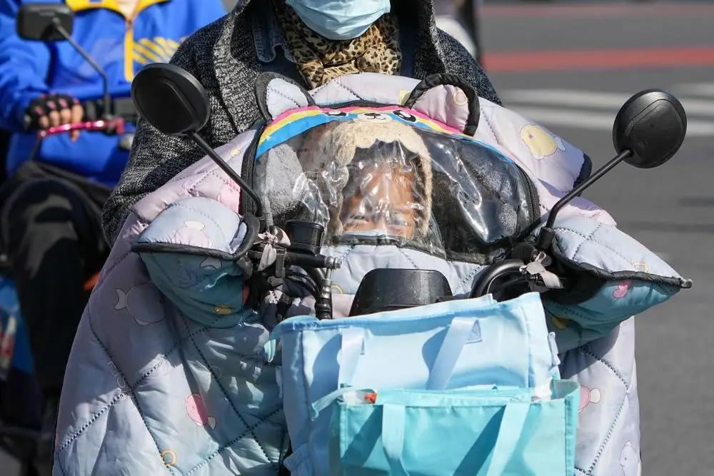 10月18日,一位小朋友在電動(dòng)自行車(chē)的擋風(fēng)后面躲風(fēng)。新華社記者 鞠煥宗 攝