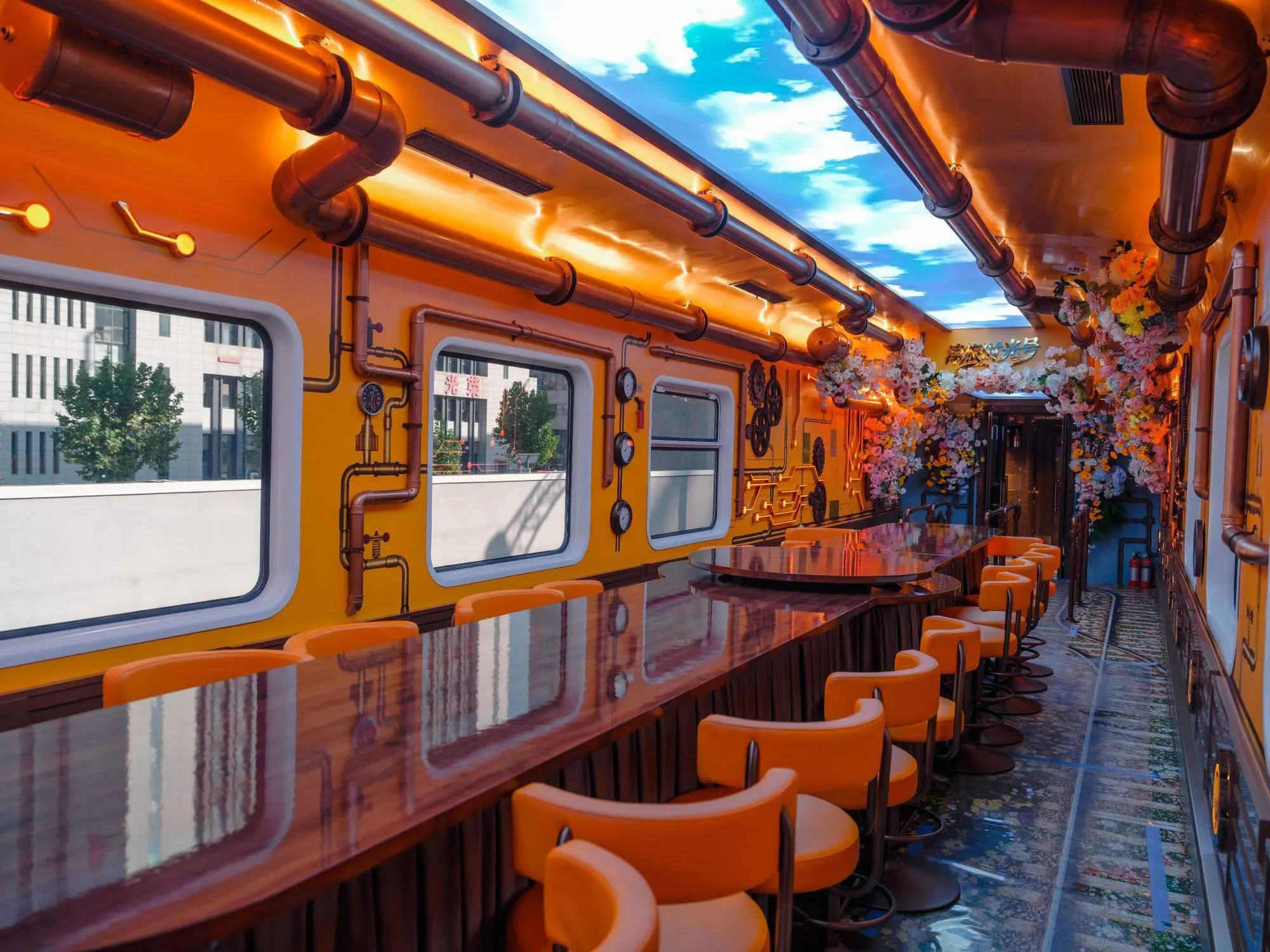 列車(chē)共設(shè)10節(jié)主題鮮明的特色車(chē)廂:分別為復(fù)古客座車(chē)廂、蒙太奇幻境互動(dòng)演藝車(chē)廂、珍奇花園俱樂(lè)部車(chē)廂、沉浸式時(shí)空穿梭機(jī)車(chē)廂以及專(zhuān)屬VIP車(chē)廂,均以沉浸式戲劇化空間為理念,將座椅拆分重組,每節(jié)車(chē)廂形成互動(dòng)或演藝區(qū),配備移動(dòng)舞臺(tái)、隱藏?zé)糗壓铜h(huán)繞音響。座椅、地面及軟裝材料兼顧安全與舒適,同時(shí)配備冷暖氣系統(tǒng)、移動(dòng)吧臺(tái)和多功能儲(chǔ)物柜,提供全方位的互動(dòng)體驗(yàn)。