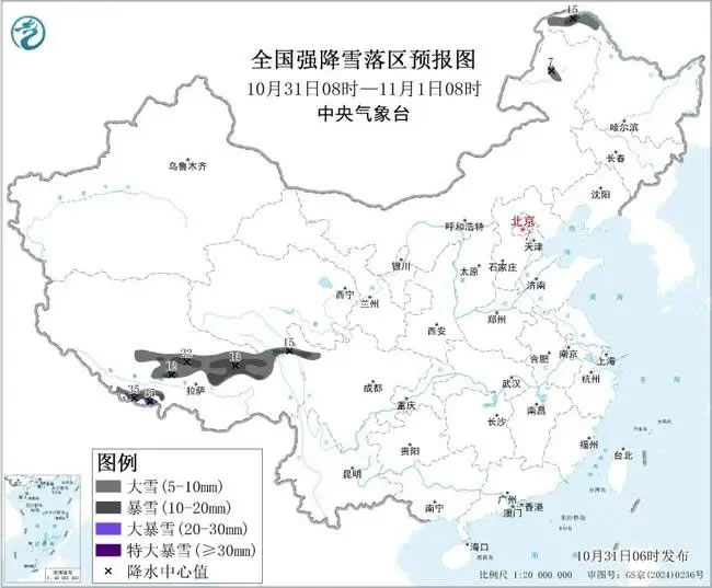 中央氣象臺10月31日6時繼續(xù)發(fā)布暴雪藍(lán)色預(yù)警:預(yù)計(jì)10月31日8時至11月1日8時,西藏中東部和西南部、川西高原北部、黑龍江西北部、內(nèi)蒙古東北部等地部分地區(qū)有大到暴雪,其中,西藏中部局地有大暴雪,西藏西南部局地有大暴雪或特大暴雪(30~35毫米)。上述部分地區(qū)新增積雪深度4~8厘米,山區(qū)局地可達(dá)15厘米以上。