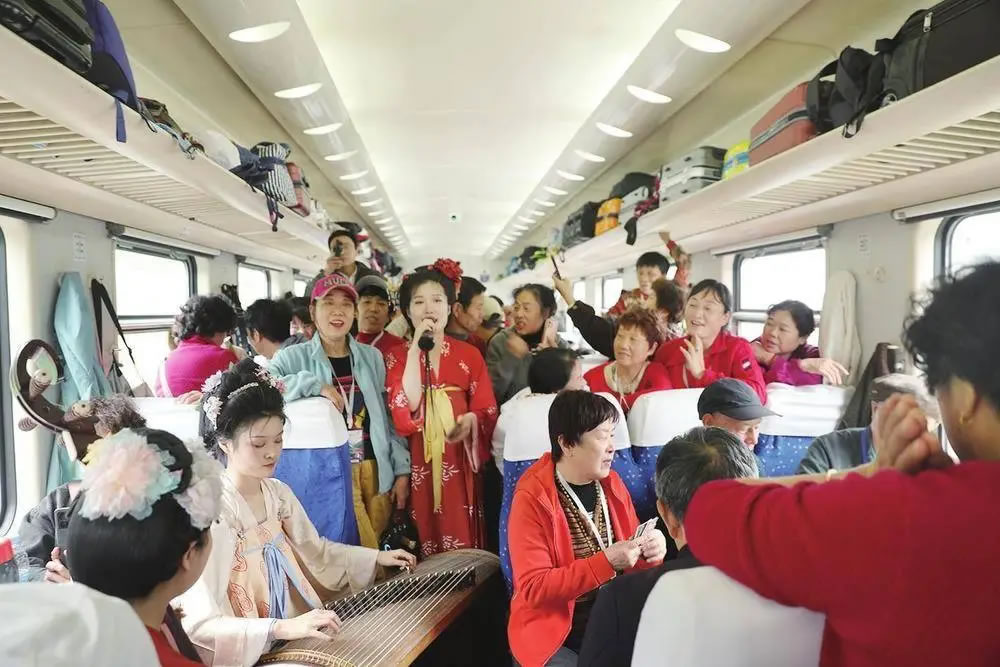 秋日的旅途被一系列精心策劃的活動填滿。候車室內(nèi),老年旅客們拉起“環(huán)秦嶺賞秋之旅”的橫幅合影留念,臉上洋溢著笑容;列車上,悠揚的古箏與清越的琵琶聲交織,唐風(fēng)歌曲緩緩流淌,瞬間讓車廂充滿雅致氛圍。身著古裝的特型演員帶來了驚喜互動,他風(fēng)度翩翩地與旅客們展開詩詞對答。旅客們踴躍接句,答對的人還能獲得定制小禮品,車廂內(nèi)歡聲笑語不斷。