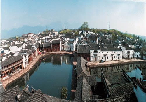 諸葛八卦村,位于浙江中西部蘭溪市境內(nèi)的群山中,據(jù)考證,該村是由諸葛亮27世孫諸葛大師于元代中后期開始營(yíng)建的。有600余年的歷史,仍保存完好,成為人們旅游訪古的新去處。村落在8座小山的合抱之中,這8座小山的分布很像八卦的樣子,形成外八卦;村中的樓宇建筑、街道八方呼應(yīng)!扮姵亍蔽挥谥行模铺珮O陰陽(yáng)魚圖,8條小巷向外輻射,形成內(nèi)八卦。