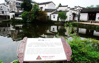鐘池位于諸葛村的中心,在大公堂正前面,面積0.24公頃,它的邊上是一塊與它逆對(duì)稱面積的陸地,村民用以曬場(chǎng)之用。易經(jīng)上說(shuō)“東南為陽(yáng)、西北為陰”再加上“天圓地方”之說(shuō),空地和鐘池正呈陰陽(yáng)太極圖形。陸地靠北和鐘池靠南各有一顆水井,正是太極中的魚眼。鐘池的南岸是一個(gè)陡坡,順著陡坡而建的幾幢大房子從北岸望去一幢比一幢高,加上前面貼水一溜小平房,跌宕起伏,輪廓線大起大落,景象峭拔而優(yōu)美。