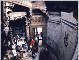 鐘池四周伸展出八條小巷,特點(diǎn)各個(gè)不同,形成了坎、艮、震、巽、離、坤、兌、乾八個(gè)部位。大公堂就在它的坎宮部位,從它的正門邊上東而去的一條十分幽深,一層層的臺(tái)階上坡,左側(cè)是綠蔭如蓋的園子,的一右側(cè)是一排排住宅的后墻,這條巷是通往村中十八廳堂之一的積慶堂的。鐘池東面條巷子很平直,100米長(zhǎng)。八條小巷似通卻閉,似連卻斷,虛虛實(shí)實(shí),猶如一張蜘蛛網(wǎng),又宛如一座迷宮。